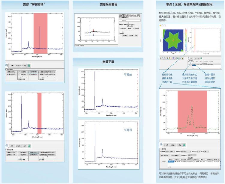 光譜 Mapping 數(shù)據(jù)處理 可以對單點(diǎn)(全圖)數(shù)據(jù)進(jìn)行預(yù)處理,包括去除“宇宙射線”、光譜基底,平滑光譜曲線等。