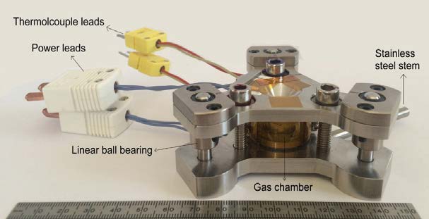 熱液金剛石壓腔是一種新型的金剛石壓腔裝置,能在顯微鏡下觀察高溫高壓或低溫高壓水體系的相變實(shí)驗(yàn)。它利用兩個(gè)金剛石砧使處于金剛石砧中部的錸樣品室墊圈壓縮密封產(chǎn)生高達(dá)3 到5 個(gè)GPa 的高壓。由碳化鎢支座、鉬加熱爐絲、陶瓷粘合劑、熱電隅及搖臺(tái)組成的加熱組件提供高達(dá)1000℃ 的溫度。配合顯微鏡或激光拉曼可以觀察相變過程,測量反應(yīng)物的組成變化??梢杂糜诩淄樗衔飳?shí)驗(yàn)、H2O 冰的高壓相實(shí)驗(yàn)、花崗巖熔融實(shí)驗(yàn)、巖石礦物組合熔融實(shí)驗(yàn)研究和可燃有機(jī)巖、石油、蒙脫石及巖石熱解實(shí)驗(yàn)、礦物中包裹體研究。