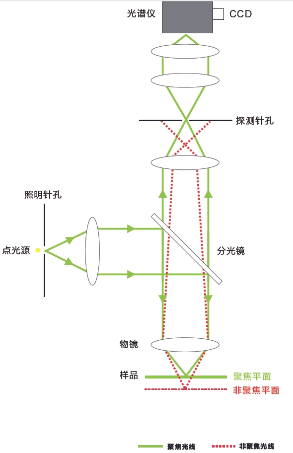 當(dāng)一個(gè)點(diǎn)光源(通常是激光)通過物鏡聚焦在樣品上,這一點(diǎn)所成的像通過探測針孔被探測器所檢測,此時(shí)照明針孔和探測針孔相對于物鏡焦平面是共軛的,即為共聚焦。在共聚焦顯微系統(tǒng)中,只有被照明樣品的散射光信號(hào)才會(huì)被接受,這就保證了橫向空間分辨率;而位于光源照明區(qū)域內(nèi),但不在焦平面上的樣品信號(hào)會(huì)由于離焦而被探測針孔(空間濾波器)強(qiáng)烈地衰減,這也就保證了縱向空間分辨率。因此, 當(dāng)我們將樣品沿著激光入射的方向上下移動(dòng)時(shí), 可以將激光聚焦于樣品的不同層,以實(shí)現(xiàn)對樣品的剖層分析。共聚焦的另外一個(gè)優(yōu)點(diǎn)是對于透明,半透明樣品,或者有較強(qiáng)熒光和黑體輻射背景的樣品來說,有較好的背景抑制的功能。
