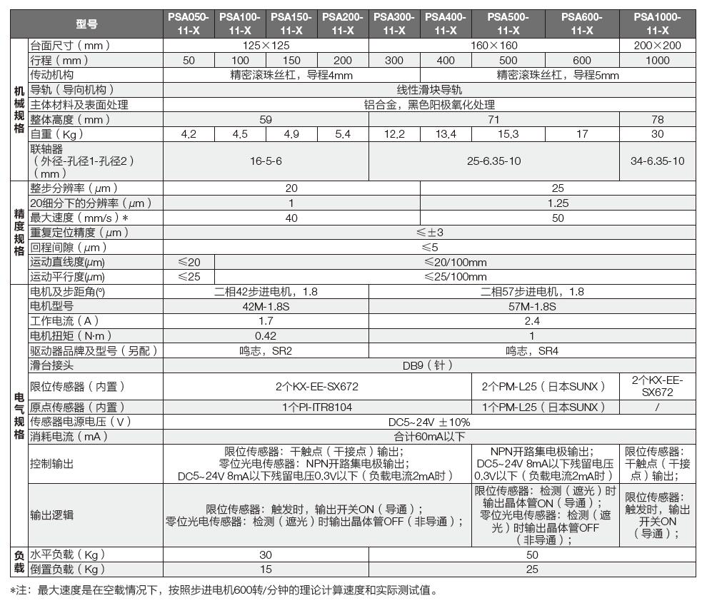 PSA系列精密電動直線滑臺選型表: