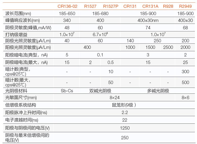 常用PMT管芯規(guī)格參數(shù)表: