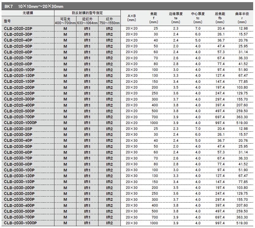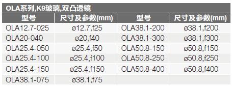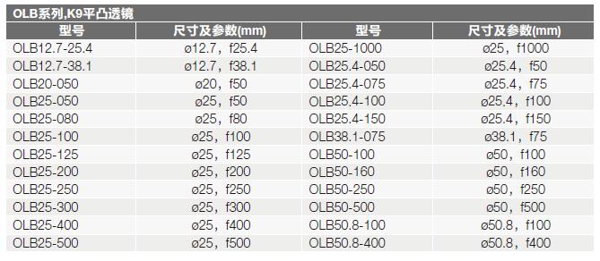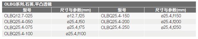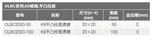 OLBC系列平凸柱面透鏡選型表: