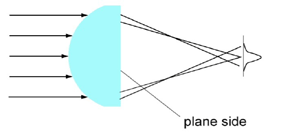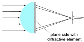 常規(guī)的平凸透鏡會(huì)產(chǎn)生不同位置的入射光焦點(diǎn)不一的問(wèn)題。采用衍射校正透鏡,是在常規(guī)平凸透鏡的平面端刻蝕像差校正的衍射微結(jié)構(gòu),從而達(dá)到整個(gè)入射光的焦點(diǎn)歸一,提高激光效率。