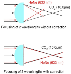 雙波長(zhǎng)透鏡組的主要功能為將兩個(gè)不同波長(zhǎng)的入射光聚焦到相同的焦點(diǎn)上,如下圖所示,采用常規(guī)的硒化鋅材料透鏡,將CO2 激光以及HeNe 激光的聚焦點(diǎn)整合到一起。