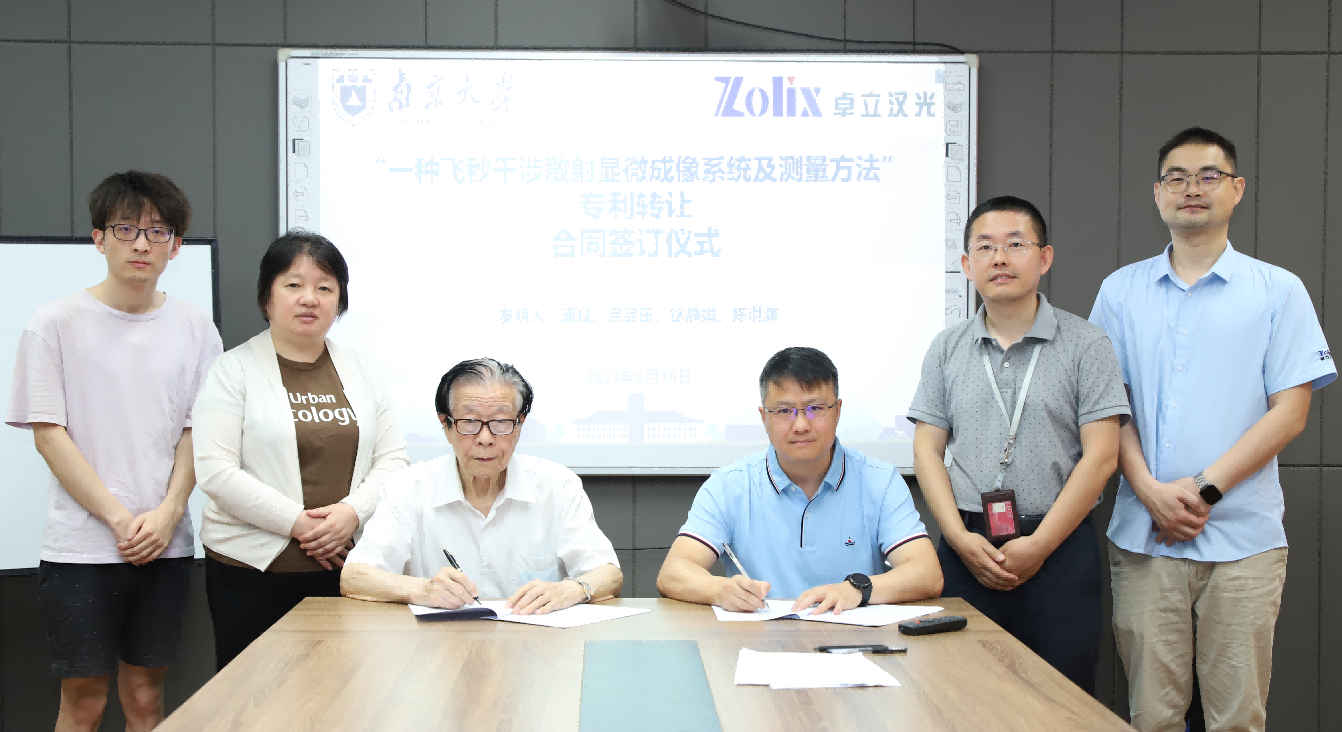 2023年6月15日,卓立漢光集團董磊副總經(jīng)理帶領(lǐng)研發(fā)團隊拜訪南京大學(xué)陳洪淵院士團隊,在南京大學(xué)仙林校區(qū)化學(xué)樓隆重舉行了“一種飛秒干涉散射顯微成像系統(tǒng)及測量方法”**轉(zhuǎn)讓的簽約儀式。
