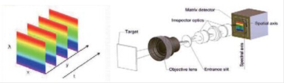 圖1 實(shí)驗(yàn)用高光譜相機(jī)及高光譜成像原理圖