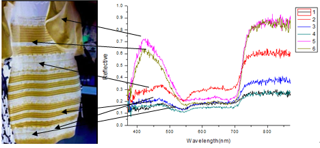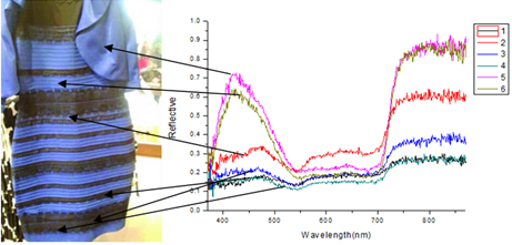 就以這個(gè)服裝的藍(lán)色(或白色)為例,其在430nm有一個(gè)反射峰,對(duì)應(yīng)藍(lán)色。在700nm后反射率升高,而每個(gè)人對(duì)700nm以上波段光的感應(yīng)是不一樣的,在700nm是人眼觀察的紅色至紅紫色區(qū)域,藍(lán)色和黃色、紅色的光混合后會(huì)出現(xiàn)白色光的結(jié)果。也就是說(shuō),有些人能對(duì)近紅外光波段區(qū)域的感應(yīng)相對(duì)寬一些(敏感一些),這就造成了衣服本身是藍(lán)色的,加上相對(duì)黃色光、紅色光感應(yīng)較為敏銳,就會(huì)造成對(duì)衣服顏色的感知為金色的(有一部分會(huì)體現(xiàn)出白色)。而紅光區(qū)域感應(yīng)相對(duì)不敏銳的人則只能夠看到與原來(lái)圖像一致的黑色和藍(lán)色。