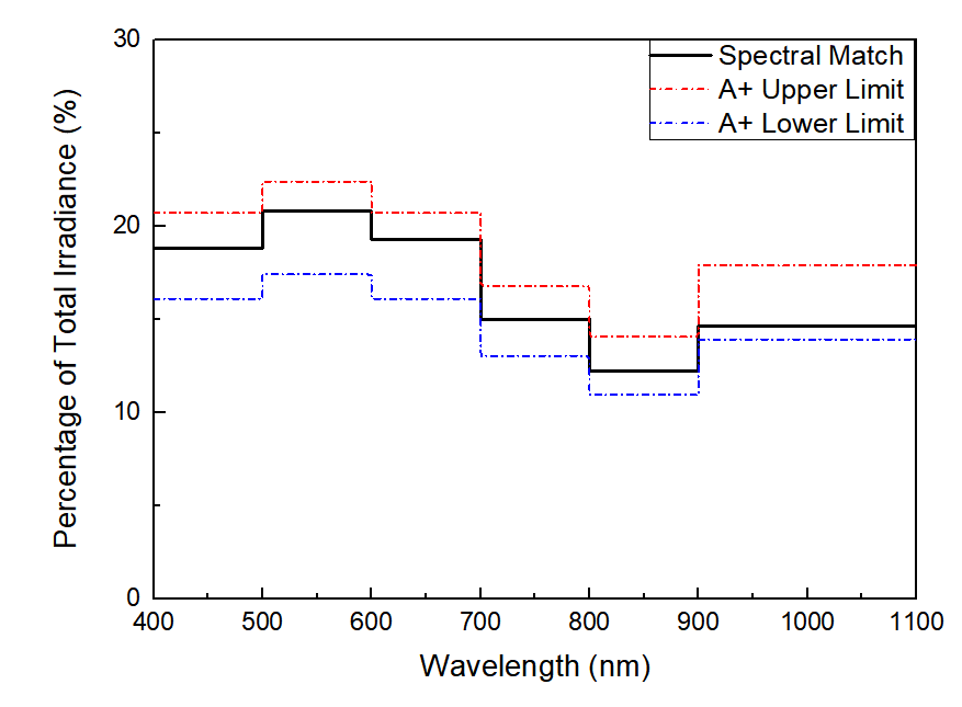 光譜匹配度定義為在6 個光譜波段內(nèi),積分得到的光譜輻照度占總輻照度的百分比,與標(biāo)準(zhǔn)太陽光譜中各個波段所占百分比的比例。例如A +級光譜匹配度規(guī)定,各個波段的占比與標(biāo)準(zhǔn)光譜的占比的比例,范圍不得超過0.875-1.125。
