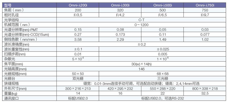 光柵規(guī)格型號表5:光柵(本系列適用于Omni-λ200i系列光譜儀)