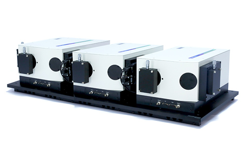 三級(jí)聯(lián)光譜儀,由三臺(tái)焦距為500mm 的“譜王”光譜儀經(jīng)過(guò)特殊調(diào)校后組合而成,前兩級(jí)譜儀作色散相減配置,主要作用是降低雜散光,后一級(jí)譜儀作色散相加配置,主要作用是提高分辨率。整臺(tái)設(shè)計(jì)能夠保證多種使用模式,既能分別作為單臺(tái)光柵單色儀,也可以作為雙聯(lián)光柵單色儀使用。一、二級(jí)譜儀采用側(cè)入雙出,而第三級(jí)譜儀采用雙入雙出,方便連接CCD 陣列探測(cè)器和PMT 等單通道探測(cè)器。每臺(tái)單色儀的光柵座上安置三塊光柵,光柵采用進(jìn)口光柵,其光譜范圍分別位于深紫外區(qū)、中紫外區(qū)和可見區(qū),每塊光柵在各自的光譜區(qū)域的反射率*大可達(dá)70% 左右,實(shí)現(xiàn)光譜在紫外-可見區(qū)域內(nèi)光譜采集。主要應(yīng)用于高端拉曼光譜測(cè)量,如紫外共振拉曼光譜。