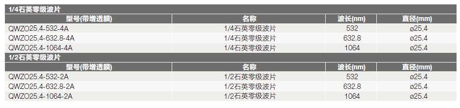 QWZO系列石英零級(jí)波片選型表: