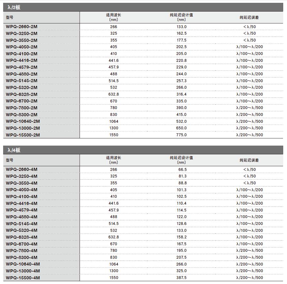 水晶波長(zhǎng)板選型表(SIGMA KOKI):