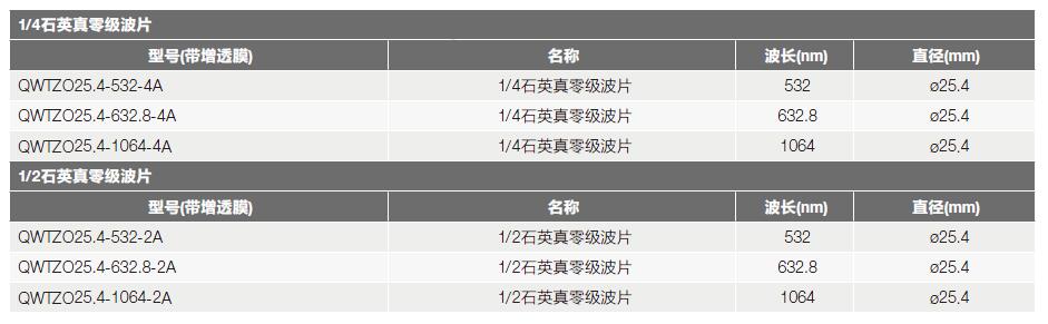 QWTZO系列真零級(jí)石英波片選型表: