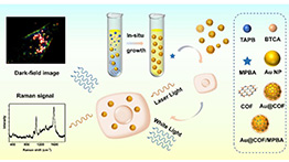 南京師范大學(xué)王琛教授課題組在Au納米粒子上覆蓋二維共價(jià)有機(jī)框架(COFs)構(gòu)建尺寸可控、富集力強(qiáng)、穩(wěn)定性高和生物相容性更好的核殼結(jié)構(gòu)(Au@COF)生物傳感器。并用拉曼光譜/暗場散射成像雙模技術(shù)實(shí)時(shí)監(jiān)測活細(xì)胞中過氧化氫代謝物水平。實(shí)驗(yàn)結(jié)果證明,該生物納米傳感器簡單、高效,可實(shí)現(xiàn)過氧化氫和細(xì)胞代謝產(chǎn)物的在線檢測。本研究為開發(fā)基于COF的SERS生物傳感平臺提供了實(shí)驗(yàn)思路,為細(xì)胞代謝產(chǎn)物相關(guān)疾病早期診斷提供一種有效方法。