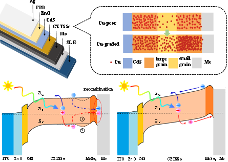硫?qū)俦∧ぬ柲茈姵匾蚱涞统杀?、帶隙可調(diào)和高輸出性能而進(jìn)入了一個(gè)蓬勃發(fā)展的時(shí)期,元素含量豐富的鋅黃錫礦Cu2ZnSn(S,Se)4(CZTSSe)是將CIGS中稀有貴金屬In和Ga用元素Zn和Sn替換,不僅與CIGS有著相似的結(jié)構(gòu)和光電學(xué)性能,也具備獨(dú)特優(yōu)點(diǎn),如儲(chǔ)量豐富、價(jià)格低廉、無毒害等。